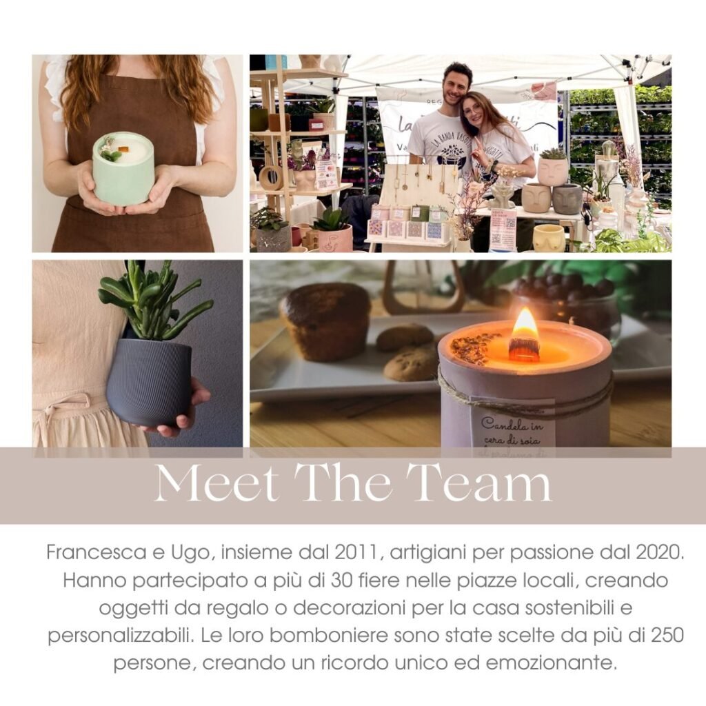 Dal 2020 assieme al mio compagno di vita, Ugo, creo oggetti di decoro per la casa, candele e bomboniere per qualsiasi tipo di evento.